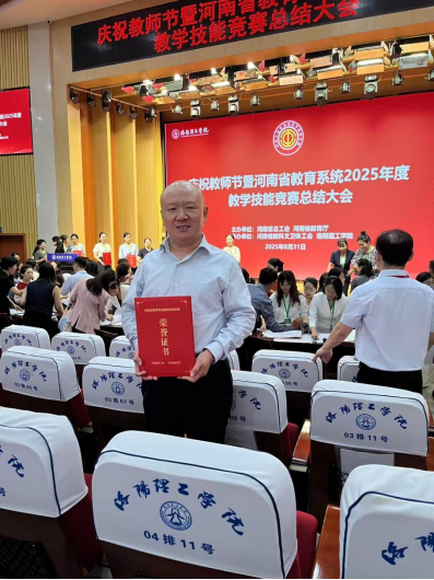 近日,由河南省总工会、河南省教育厅联合主办,河南省教科文卫体工会和洛阳理工学院共同承办的河南省教育系统2025年教学技能竞赛高校组决赛在洛阳举行。我院选派的尚增振老师凭借扎实的教学基本功和出色的现场表现,荣获一等奖。实现我院在该项赛事的历史性突破。